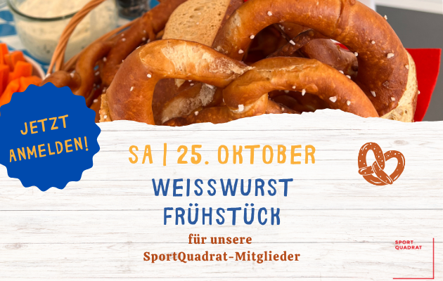 Am Samstag, 25. Oktober wird’s zünftig bei uns im SportQuadrat! Wir laden zu unserem traditionellen Weißwurst-Frühstück mit einem Paar Weißwürste, einer Brezel und weiteren vegetarischen Kleinigkeiten zum Essen ein. Gerne begrüßen wir euch zu Beginn mit einem Getränk eurer Wahl.